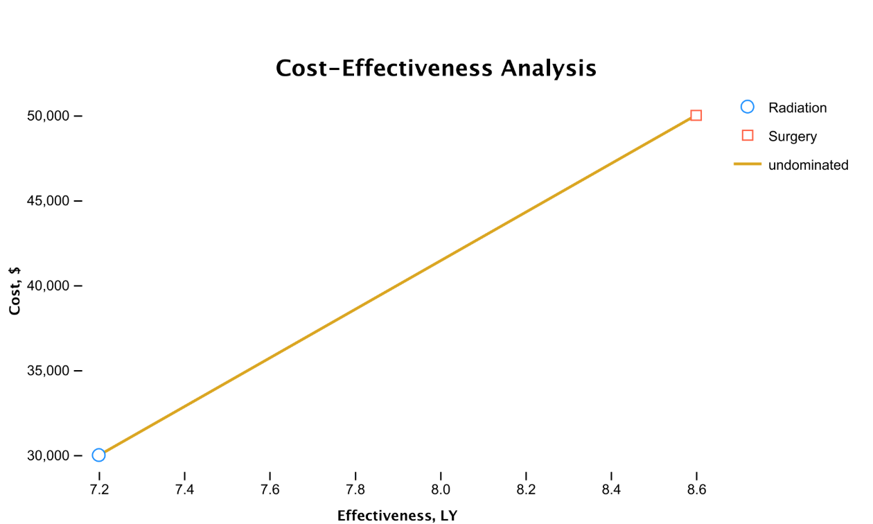 敏感性分析中还可以设置策略切换条件,当某变量超过某一临界值时模型输出推荐策略发生变化。例如:当治疗成本高于8000时推荐放弃治疗,低于时则推荐接受治疗。